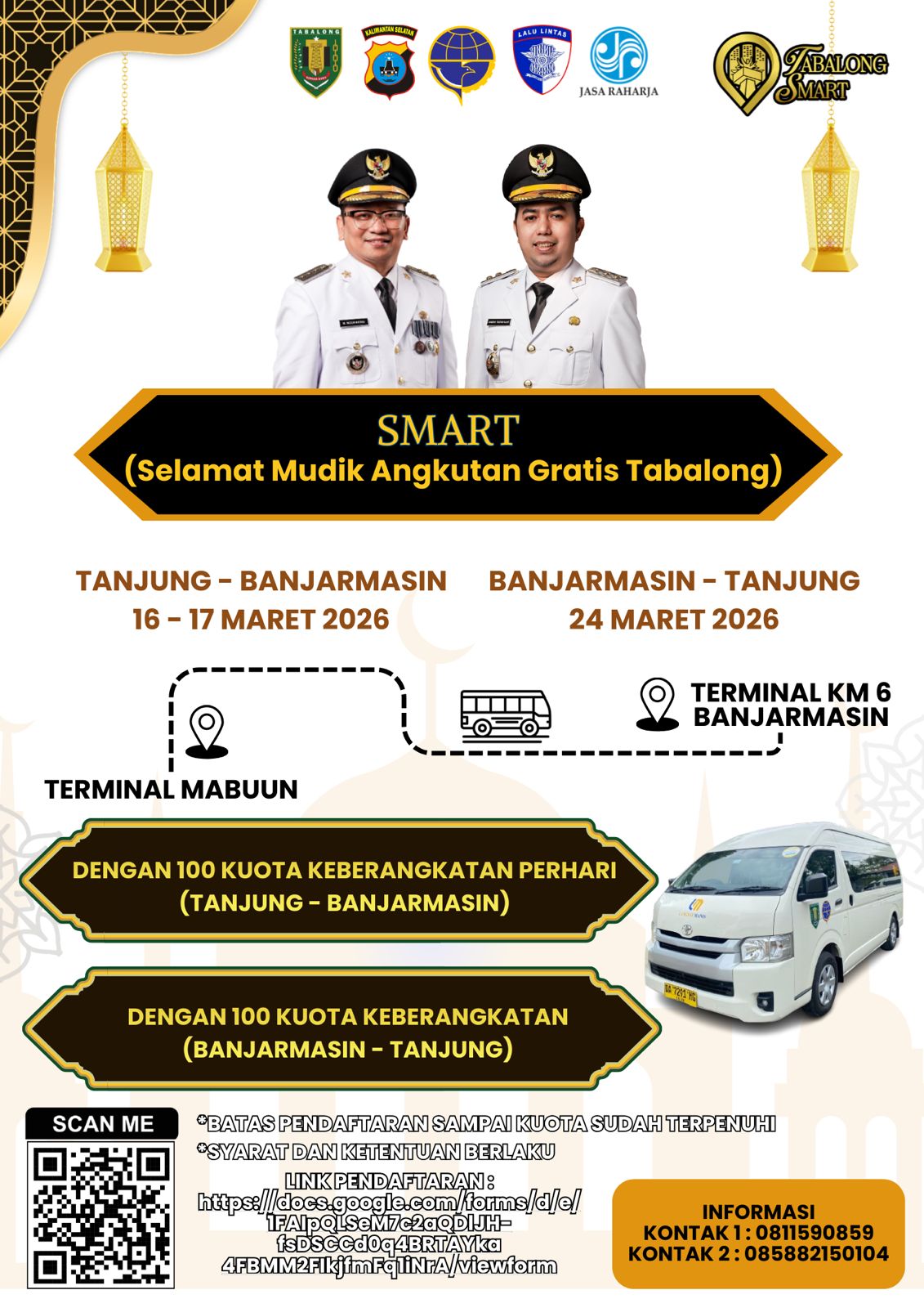 masyarakatSelesaiMudik Angkutan GratisWaktu Pelaksanaan16 Mar 2026 - 24 Mar 202608:00 - 21:00 WIBLokasiTerminal MabuunLihat di Google MapsLokasi KantorTerminal MabuunGoogle MapsDeskripsiBagikan agenda ini:FacebookTwitterWhatsApp